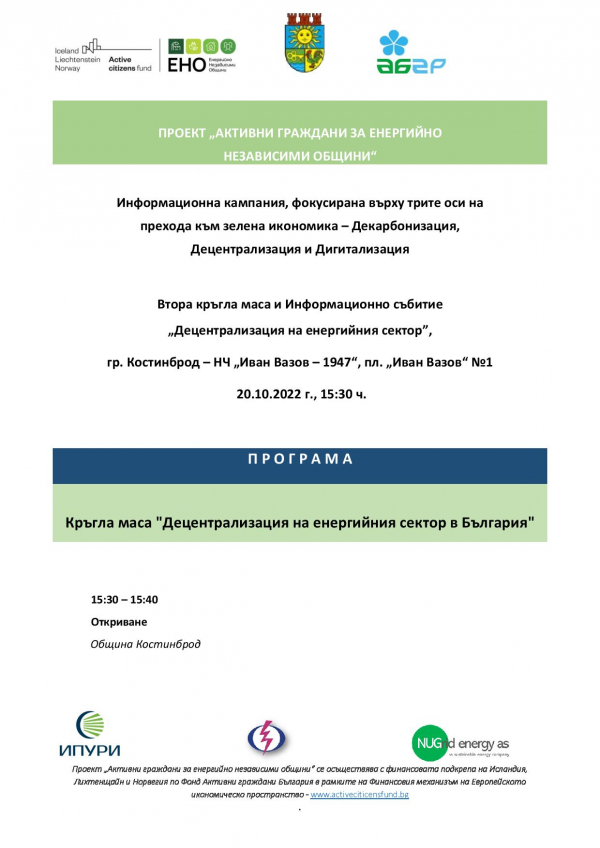 Асоциация на българските градове и региони /АБГР/, съвместно с Община Костинброд, организират Кръгла маса и Информационна среща на тема „Децентрализация на енергийния сектор в България”.