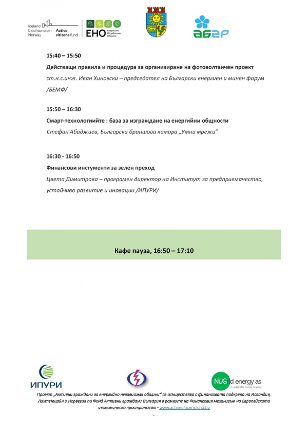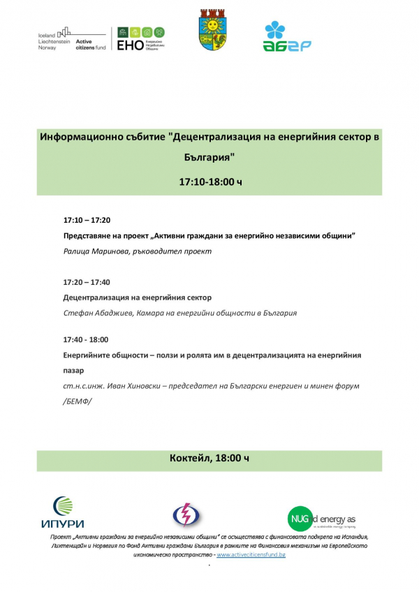 Събитията са част от информационна кампания, фокусирана върху трите оси на прехода към зелената икономика – Декарбонизация, Децентрализация и Дигитализация, на ПРОЕКТ „АКТИВНИ ГРАЖДАНИ ЗА ЕНЕРГИЙНО НЕЗАВИСИМИ ОБЩИНИ“, който се осъществява с финансовата подкрепа на Исландия, Лихтенщайн и Норвегия по Фонд Активни граждани България в рамките на Финансовия механизъм на Европейското икономическо пространство.