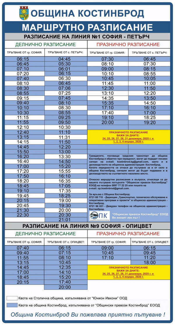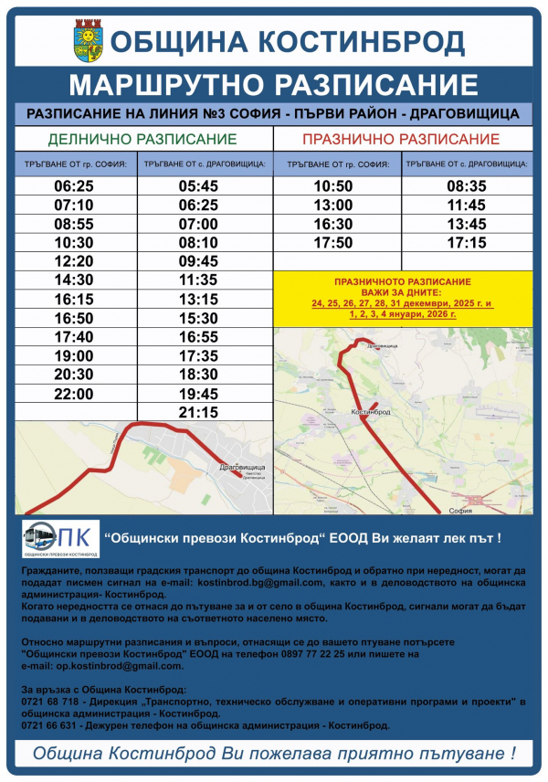 Община Костинброд информира жителите и гостите на града, че във връзка с настъпващите Коледни и Новогодишни празници се въвежда специално празнично разписание за автобусните линии: „София – Петърч“, „София – Опицвет“ и „София – Драговищица“.