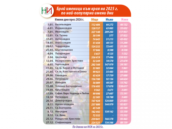 По отношение на общата разпространеност в страната, най-много носители продължават да имат имената Георги – 138 653 души, и Мария – 99 335 души. Традиционно най-много именици има на Цветница, когато празнуват общо 336 419 българи.