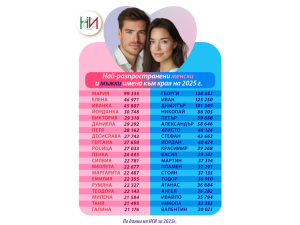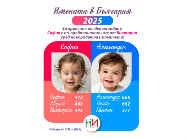 Актуалното изследване на НСИ разкрива кои са най-често избираните имена за новородени у нас през 2025 година. Ако при момчетата лидерската позиция остава непроменена и се заема от името Александър, то при момичетата настъпва важна промяна – след девет последователни години Виктория отстъпва първото място на София.