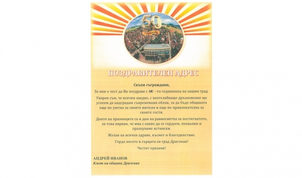 С поздравителен адрес кметът на Драгоман Андрей Иванов се обърна към съгражданите по повод 50-годишнината от обявяването на селището за град. Приветствието е публикувано на официалния сайт на общината. Ето и пълният текст: