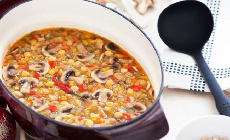 Към зеленчуковата смес се прибавят нахутът и добре измитата лещата (без гъбите). Сипва се бульонът и всичко се разбърква.