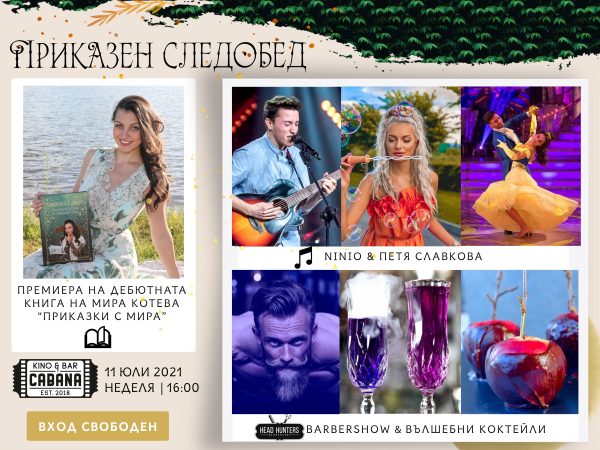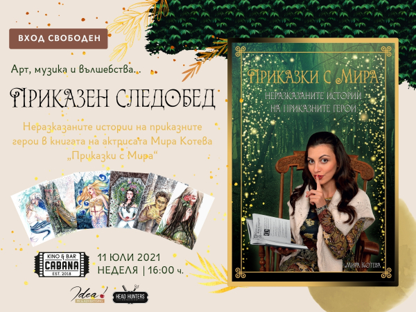 Арт, музика и вълшебства Ви очакват на нестандартната премиера на първата книга на актрисата Мира Котева „Приказки с Мира“, която ще се проведе на 11 юли от 16 часа в Кино & Бар Кабана, гр. София, с вход свободен.