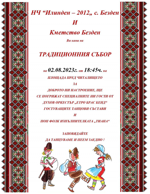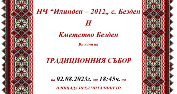 И тази година, костинбродското село Безден ще празнува традиционния си събор. Събитието ще се състои на 2 август, от 18.45 ч., на площада пред сградата на Читалището. За доброто настроение на всички присъстващи ще се погрижат духов оркестър „Етро Брас Бенд“, гостуващи танцови състави и фолк изпълнителката Тиана.