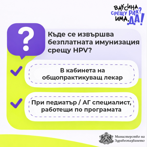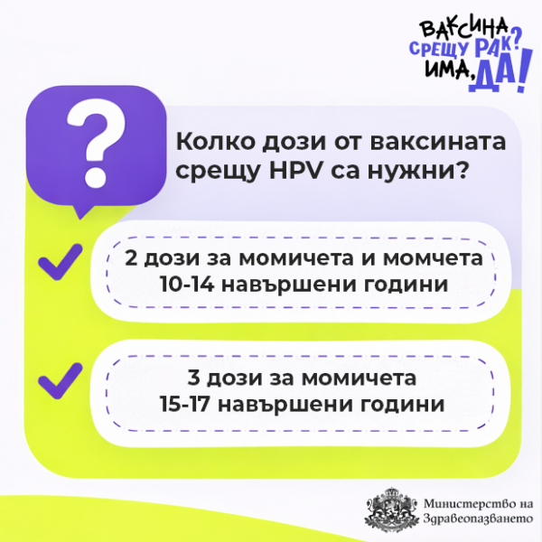 Министерството на здравеопазването обявява разширяване на обхвата на безплатната имунизация срещу човешки папилома вирус (HPV). От 2026 г. право на безплатна ваксина вече ще имат и момичета от 15 до 18 ненавършени години, които не са били ваксинирани през предходните програмни периоди.