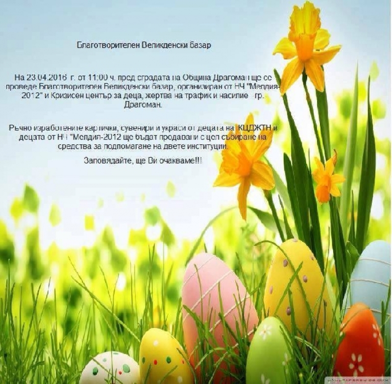 На 23 април от 11:00 часа пред сградата на община Драгоман ще се проведе благотворителен Великденски базар. Организатори на събитието са НЧ „Мелдия 2012” и Кризисен център за деца, жертва на трафик и насилие – гр. Драгоман.