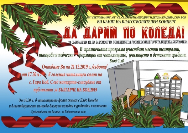 Благотворителен концерт „Да дарим по Коледа“ ще се проведе на 21 декември, в големия читалищен салон на с. Гара Бов. Негови отганизатори са НЧ „Светлина-1896“, ОУ „Св. Св. Кирил и Методий“ и Детска градина, Гара Бов. Каузата на събитието е да се съберат 400 лв. за ремонт на помещение за „Родителки кът“ в читалищната библиотека.
