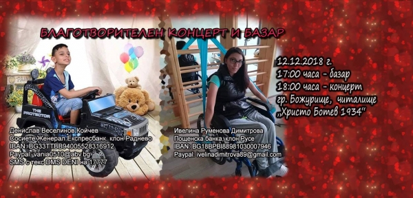 Коледен благотворителен концерт и базар по надслов „Благотворително с вяра в доброто за Ивелина и Дени“ ще се състои на 12 декември в НЧ „Христо Ботев 1934“ град Божурище. Благотворителният базар е с начален час 17:00 ч., а концертът ще започне в 18:00 ч.