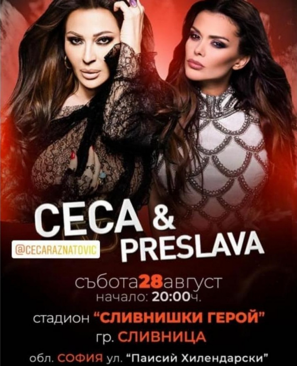 Тази събота, 28 август, жители и гости на град Сливница ще могат да посетят концерта на едни от най-любимите попфолк изпълнителки на българска и сръбска сцена – Преслава и Цеца Величкович.