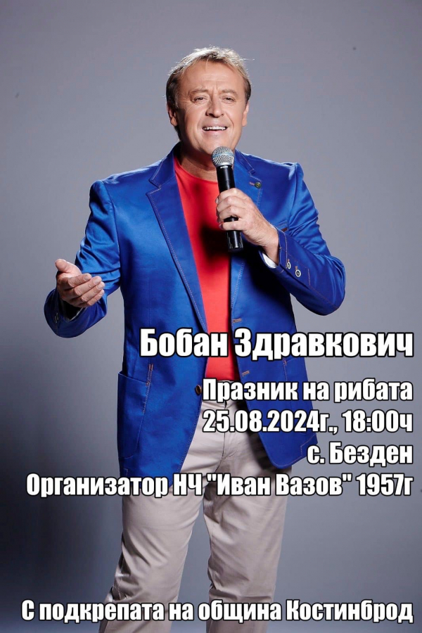 Бобан Здравкович ще пее на Празника на рибата в село Безден. Събитието ще се състои на 25 август, от 18:00 часа в центъра на селото. Негов оргранизатор е НЧ „Иван Вазов 1957“, с подкрепата на Община Костинброд. Всички жители и гости на Безден са добре дошли да споделят празника!