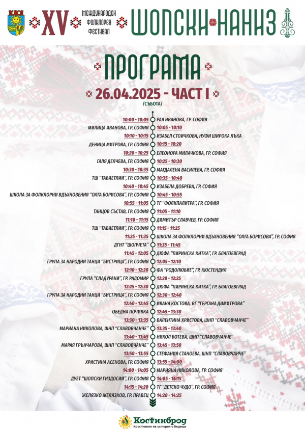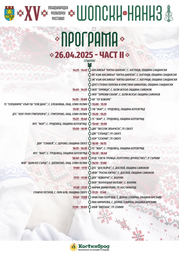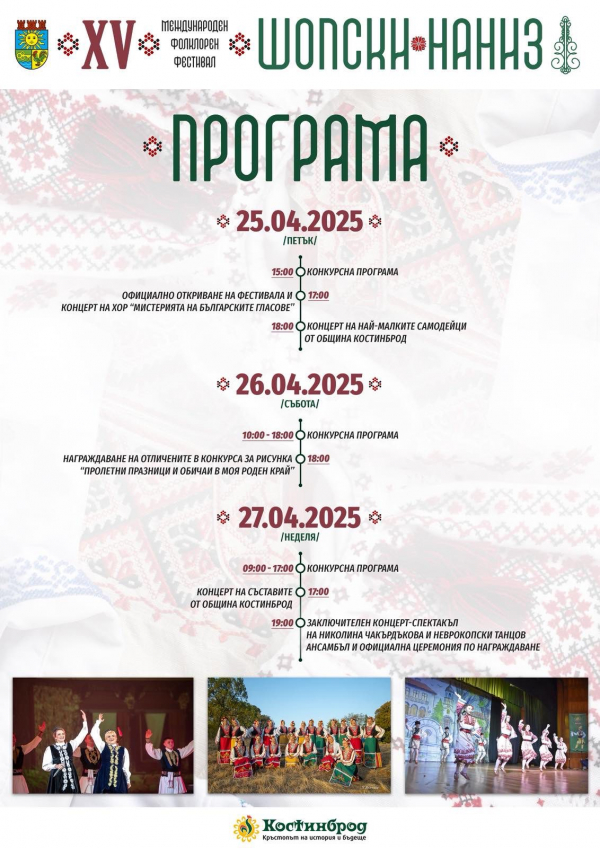 Фестивалът ще започне днес (25 април) в 15:00 ч. с конкурсна програма, а официалното откриване ще се състои в 17:00 ч., последвано от концерт на световноизвестния хор „Мистерията на българските гласове“. В 18:00 ч. сцената ще бъде превзета от най-малките самодейци от община Костинброд, които ще представят своя талант и обич към българските традиции.