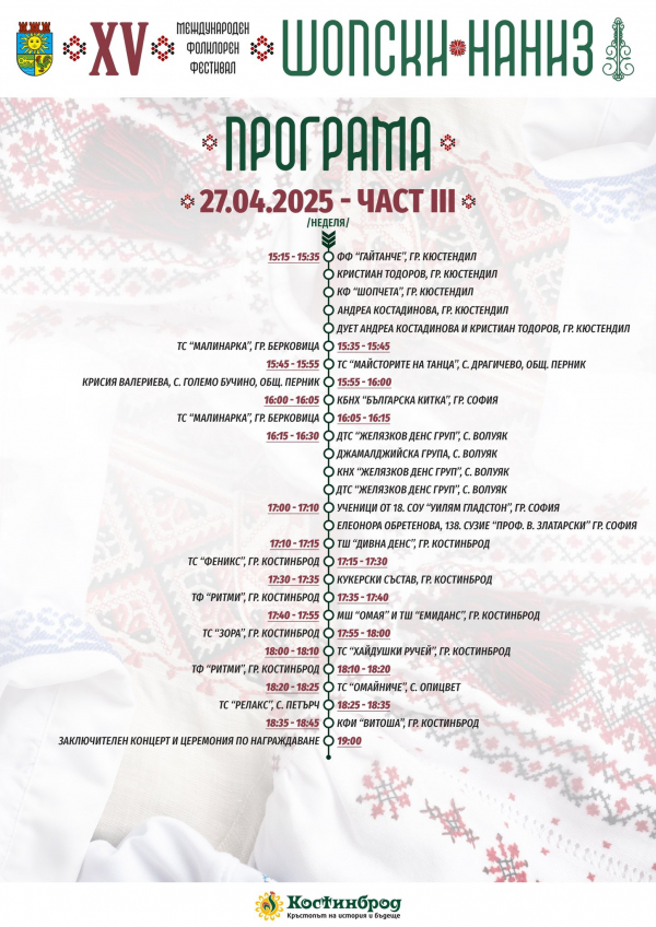 Финалният ден, 27 април (неделя), ще бъде изпълнен с още фолклорни емоции. От 9:00 до 17:00 ч. ще продължат конкурсните изяви, а от 17:00 ч. ще се състои концерт на съставите от община Костинброд. Празничната програма ще завърши в 19:00 ч. със зрелищен заключителен концерт-спектакъл на Николина Чакърдъкова и Неврокопския ансамбъл за народни танци, както и с официалната церемония по награждаване на участниците.