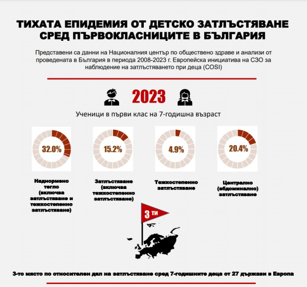 България заема трето място по относителен дял на затлъстяване сред първокласници от 27 държави в Европа. Това показват данните от проведено през миналата година проучване в рамките на Европейската инициатива на Световната здравна организация за наблюдение на затлъстяването при деца (COSI).