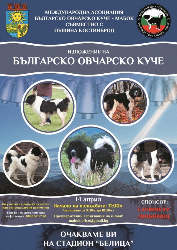 Международната асоциация Българско овчарско куче, съвместно с община Костинброд канят всички собственици на овчарски кучета от български породи да се съберат на изложение в града. Събитието ще се проведе на 14 април на стадион "Белица" и е отворено както за кучета с родословие, така и за такива без.