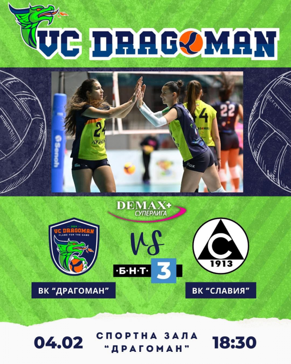 Волейболният отбор на ВК „Драгоман“ излиза в домакински двубой срещу ВК „Славия“ в среща от първенството на Demax+ Суперлигата. Мачът ще се играе на 4 февруари (сряда) 2026 г. от 18:30 ч. в Спортната зала в Драгоман.