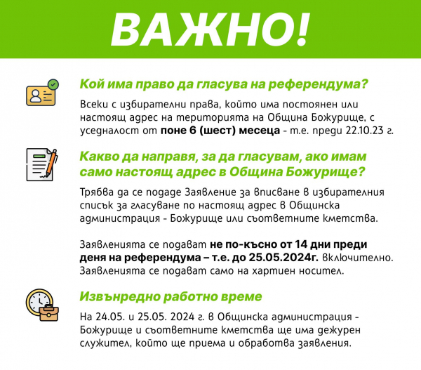 На 24.05. и 25.05. 2024 г. в Общинска администрация – Божурище и съответните кметства ще има дежурен служител, който ще приема и обработва заявления.