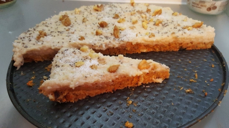 Може да оставите тортата в хладилника за през нощта, за да стегне или да я сложите в камерата за 1-2 часа. Поръсете с орехи, стафиди, настъргани моркови, чиа семена или нещо друго по ваш вкус!