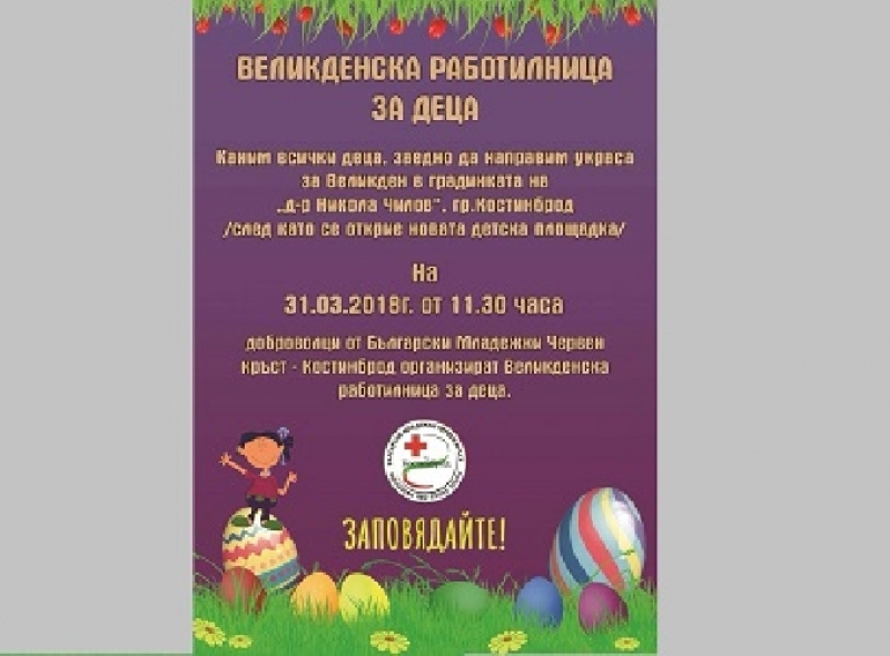 Великденска работилница за деца организира Български младежки червен кръст-Костинброд. Тя ще се проведе след откриването на новата детска площадка в градината „Д-р Никола Чилов“ в града – в 11:30 часа на 31 март 2018 г.