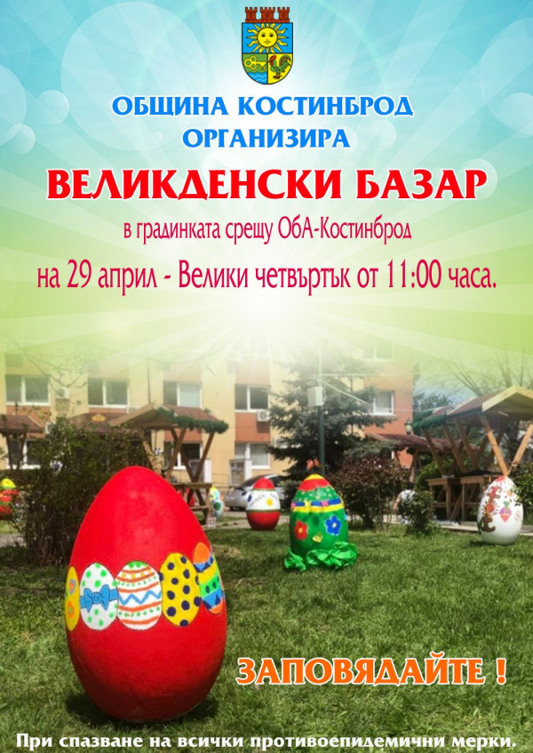 Община Костинброд призова жители и гости на града и района да заповядат на 29 април в градинката срещу общинска администрация-Костинброд, на организиран, по случай предстоящите празници, Великденски базар.