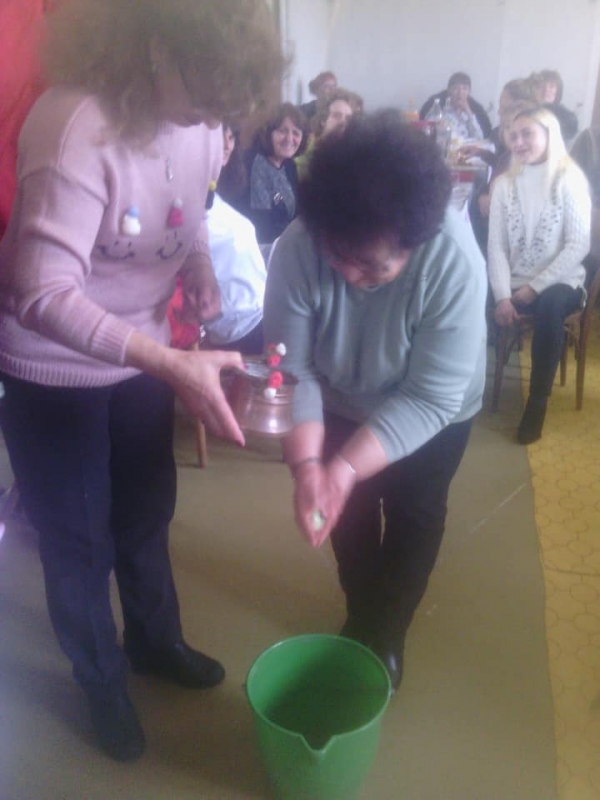 Младата майка Елисавета и акушерката Юлия Динкова пресъздадоха ритуала по поливане на ръцете на „бабата“ в следващата част от празника.