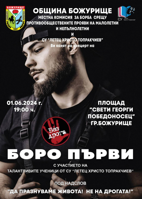 В 18.00 ч. на 1 юни, на централния площад „Свети Георги Победоносец“ в града, ще започне пъстър, цветен и щастлив празник за най-малките жители на общината. В 19.00 ч. започва концертът на изпълнителят Боро Първи. Концертът е организиран от Община Божурище и МКБППМН, съвместно със СУ „Летец Христо Топракчиев“ и е под надслов „Да празнуваме живота! Не на дрогата!“.