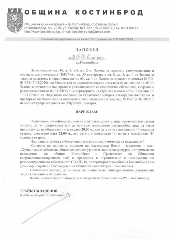 Община Костинброд Ви информира за въвеждането на вечерен час на нейна територия.