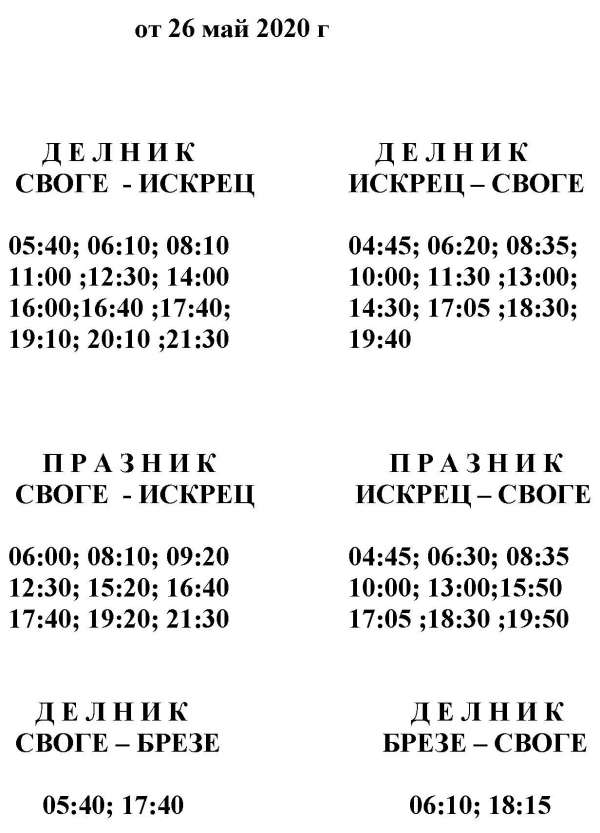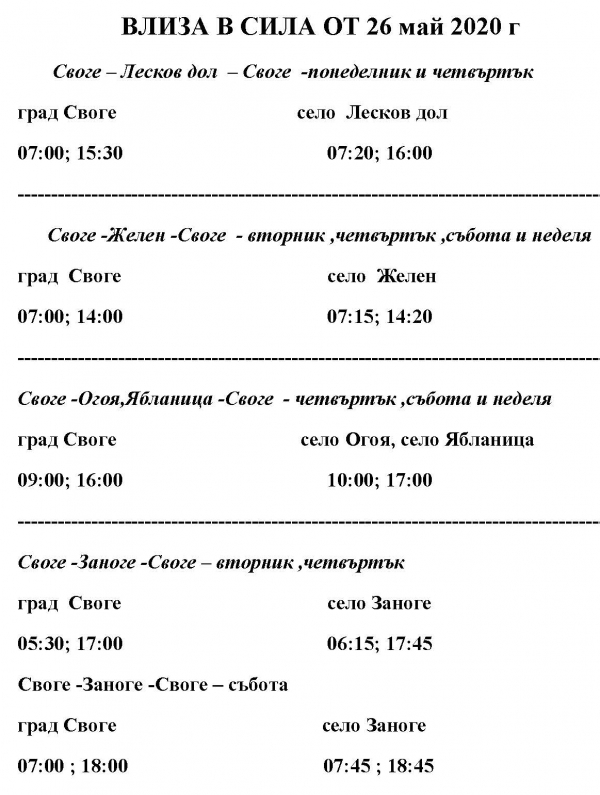 Вижте новото разписание на автобусите в община Своге, влизащо в сила от 26-ти май: