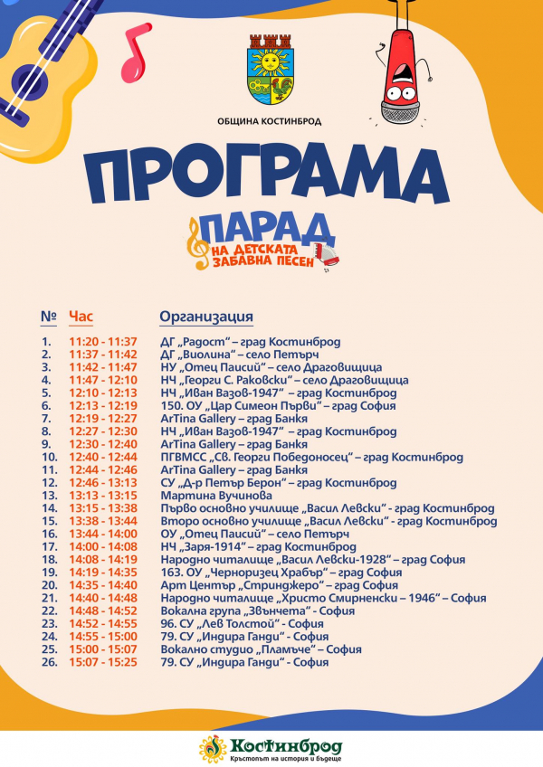 И тази година, град Костинброд ще бъде домакин на музикалния конкурс „Парад на детската забавна песен“. Събитието се организира от Община Костинброд, НЧ „Иван Вазов 1947“ и Местна комисия за борба с противообществените прояви на малолетни и непълнолетни.