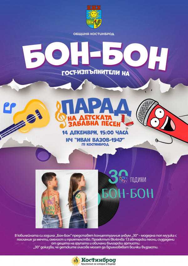 В тазгодишното издание на вокалния конкурс „Парад на детската забавна песен“ специални гости ще бъдат малките-пораснали артисти от група „Бон-Бон“. Появата им на сцената е част от отбелязването на юбилейната година на формацията и представянето на албума „30“, носещ послания за приятелство, смелост и реализиране на мечтите.