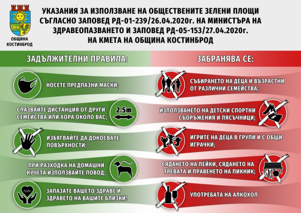 Община Костинброд публикува в официалния си уебсайт указания за използване на обществените зелени площи, съгласно заповед РД-01-239/26.04.2020г. на министъра на здравеопазването и заповед РД-05-153/27.04.2020г. на кмета на община Костинброд: