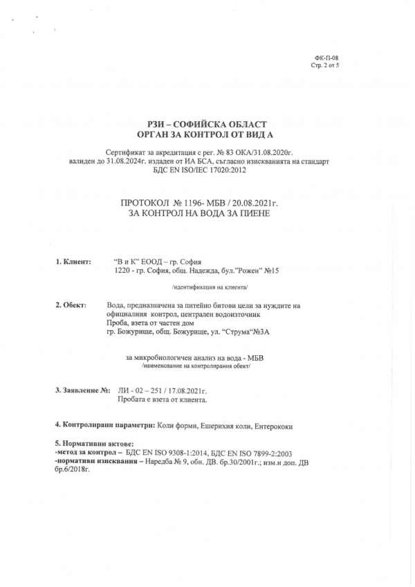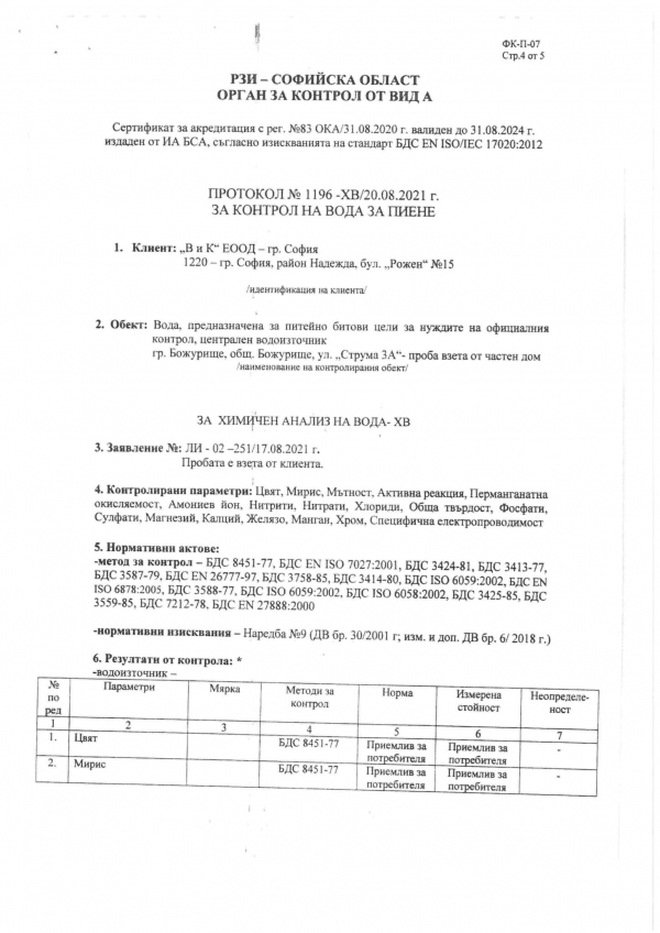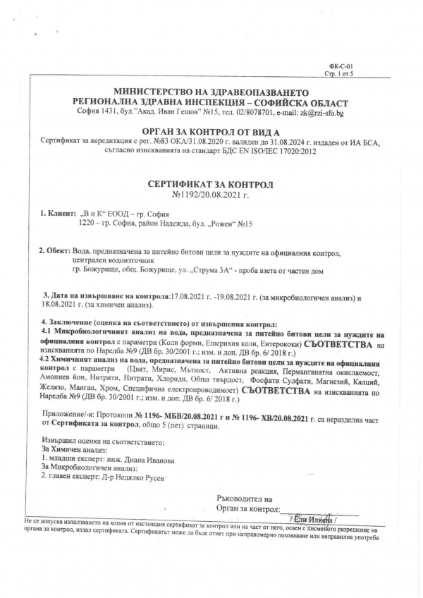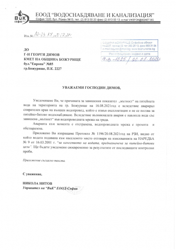 Прилагам за сведение официалния отговор на ВиК - София Област, Протоколи на РЗИ за контрол на водата за пиене и Сертификат за контрол.“.