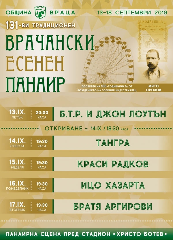 131-то издание на Врачанския есенен панаир ще бъде закрито с концерт на легендарния дует, чиито песни и днес са хитови - Братя Аргирови. На 17 септември, известните близнаци Благовест и Светослав ще изпълнят вечните песни „Замирисва на море“, „До вчера“, „Точно в пет“ и др.