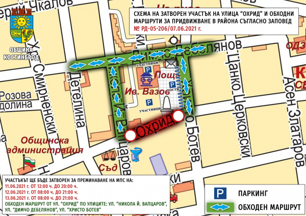 Определен е и обходен маршрут за движение движение на МПС-та в централната градска част на Костинброд - от улица „Охрид“ по улиците: „Никола Й. Вапцаров“, „Димчо Дебелянов“ и „Христо Ботев“, като се забранява паркирането на МПС-тата на уличните платна и тротоарните площи по обходния маршрут.