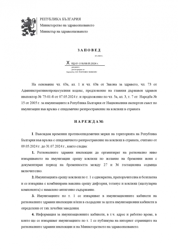От 9 май до 31 юли 2024 г., въвеждат ременни противоепидемични мерки заради епидемичното разпространение на коклюш. Това става ясно от заповед на министъра на здравеопазването в служебния кабинет д-р Галя Кондевана. Мерките предвиждат и регионалните здравни инспекции да организират на регионално ниво извършването на имунизации срещу коклюш по желание на бременни жени с документиран период на бременността между 27 и 36 гестационна седмица включително.