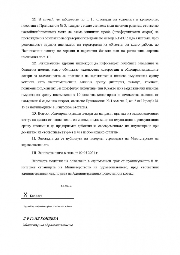 При регистриране на случай на коклюш в организиран детски и ученически колектив да се засилят мерките по проветряване, влажно почистване и дезинфекция на повърхности и под, да се осигурят достатъчно количества течен сапун, подходящи биоциди за дезинфекция на ръце и салфетки за еднократна употреба за подсушаване на ръцете във всяко санитарно помещение, както и в тоалетните за всички деца и за персонала; да се провежда ежедневна проверка на деца и ученици за наличие на клинични симптоми за заразна болест, включващи наличие на хрема, кашлица, обрив и други, като детето/ученикът с проявени симптоми не се допуска в или се отстранява от детския/ученическия колектив, се допълва в заповедта. Посещение в детското заведение или в училище е възможно след предоставяне на медицински документ от лекар, че детето не е заразно болно.