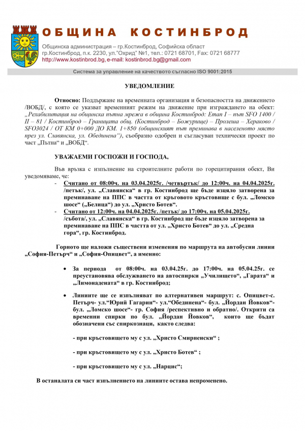 - За периода от 08:00 ч. на 03.04.2025 г. до 17:00 ч. на 05.04.2025 г.  се преустановява обслужването на автобусните спирки „Училището“, „Гарата“ и „Лимонадената“ в гр. Костинброд;