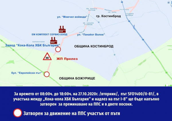 Във връзка със Заповед №РД-483/19.10.2020 г. на кмета на Община Божурище за стартиране на „Реконструкция и рехабилитация на общински път SFO1400 /II-81/ Костинброд-граница общини (Костинброд-Божурище) - Пролеша - Хераково /SFO3024/ за времето от 08:00 ч. до 18:00 ч. на 27.10.2020 г. /вторник/, път SFO1400 /II-81/- в участъка между завод на „Кока-Кола ХБК България“ и надлез на път I-8 ще бъде напълно затворен за преминаване на ППС в двете посоки за движение. За това информират от Община Костинброд.