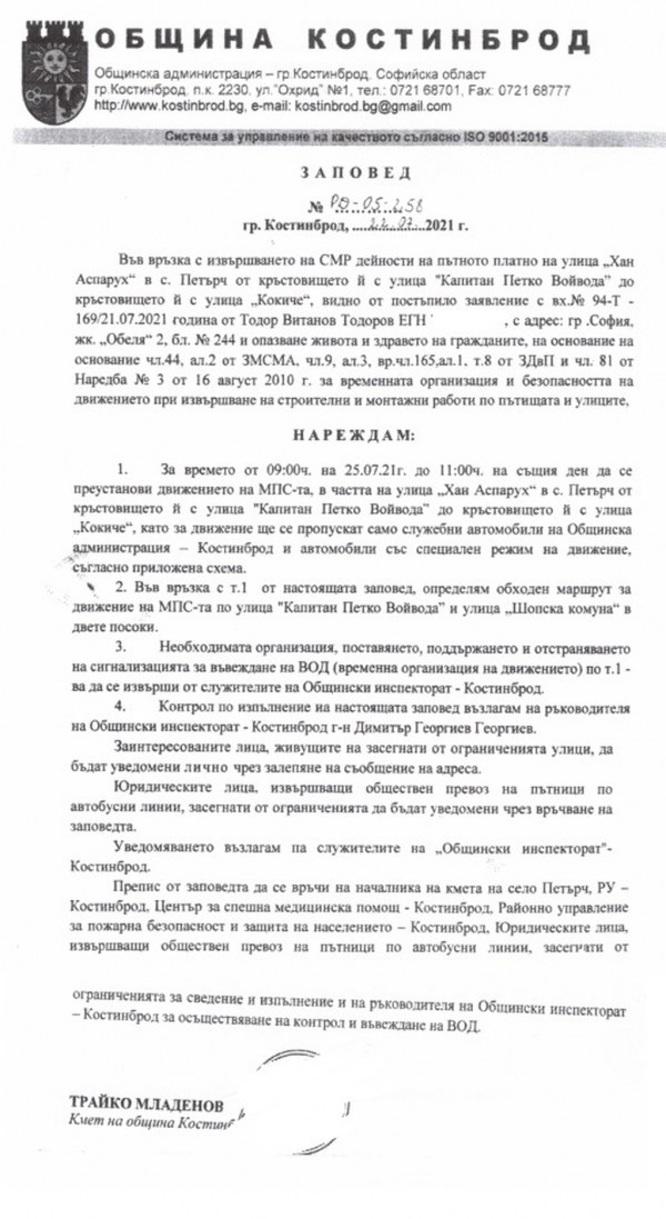 Частта на улица „Хан Аспарух“ в с. Петърч, от кръстовището й с улица „Капитан Петко Войвода“ до кръстовището й с улица „Кокиче“ ще бъде затворена за движение на МПС-та, за времето от 09:00 ч. до 11:00 ч. на 25.07.2021 г. Това става ясно от заповед на кмета на община Костинброд - Трайко Младенов, публикувана на сайта на местната администрация.