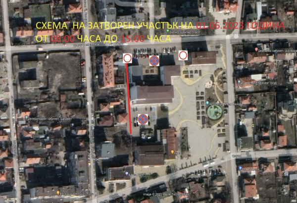 Във връзка с извършване на строително монтажни работи на обект: „Изграждане на покрита сцена на площад „Иван Вазов“, на 01.06.2023 година /четвъртък/, за периода от 08.00 до 15.00 ч., ще бъде затворен подхода към паркинга между читалище „Иван Вазов“ и ресторант „Нива“, както и южната част на паркинга на ул. „Димчо Дебелянов“.