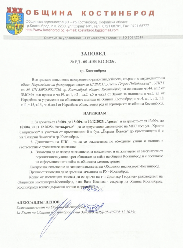 Община Костинброд информира жителите и гостите на града за предстоящи временни промени в организацията на движение, наложени от строително-ремонтни дейности по изграждането на новия физкултурен салон към ПГВМСС „Свети Георги Победоносец“. Съоръжението се реализира в УПИ 1, кв. 89, ПИ 38978.900.7736 и представлява ключова инвестиция в подобряване на спортната инфраструктура за учениците.