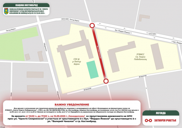 На 15 септември 2025 г. (понеделник) в часовия диапазон от 13:00 до 17:00 ч. ще бъде преустановено преминаването на моторни превозни средства по ул. „Христо Смирненски“ в участъка от кръстовището с бул. „Йордан Йовков“ до кръстовището с ул. „Валерий Чакалов“.