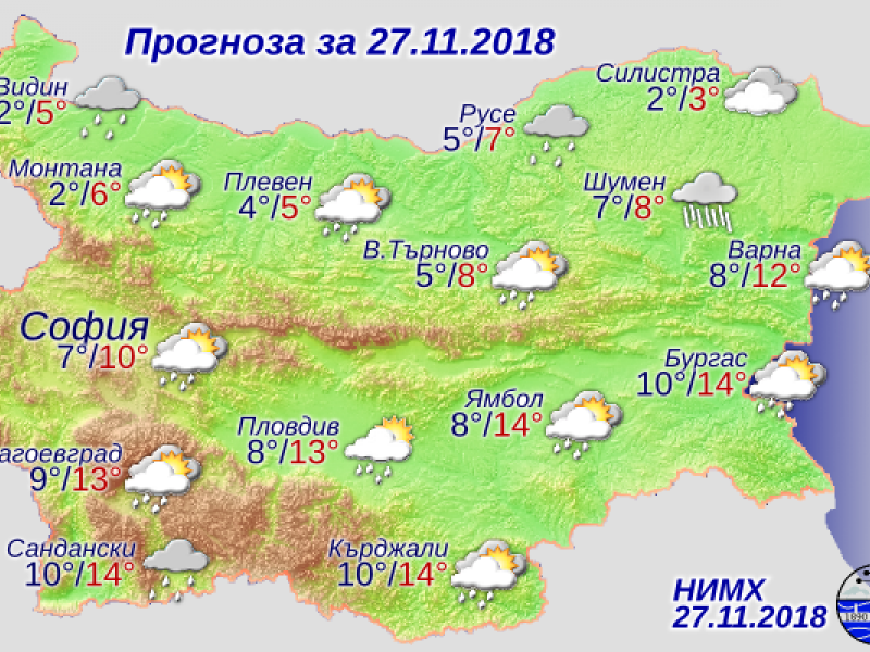 По Черноморието ще бъде предимно облачно. По-късно след обяд ще започнат валежи от дъжд, по-значителни по южното крайбрежие. Вятърът постепенно ще се ориентира от североизток и ще е слаб до умерен, но по-късно след обяд ще се усилва. Максимални температури от 7-8° в крайните северни, до 15-16° в крайните южни райони. Температурата на морската вода е 10-12°. Вълнението на морето ще е 2-3 бала.