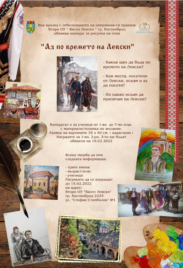 Конкурс за рисунка на тема „Аз по времето на Левски“ организират Второ ОУ „Васил Левски“ , гр. Костинброд. Инициативата е по повод патронния празник на костинбродското училище и в нея могат да се включат ученици от I до VII клас, в следните направления - „Какъв щях да бъда по времето на Левски?“, „Кои места посетени от Левски, искам и аз да посетя?“ и „По какво искам да приличам на Левски“