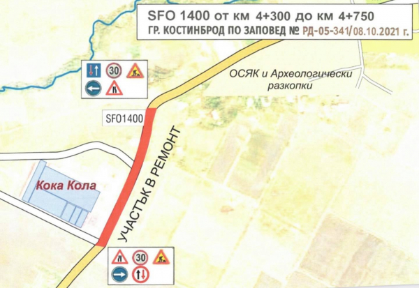 Въведена е временна организация на двете платна за движение по общински път SFO1400 /II-81/ Костинброд-граница общини (Костинброд-Божурище) - Пролеша - Хераково /SFO3024/, от км. 4+300 до км. 4+750 /от ТИР паркинга до централния вход на завода за производство на газирани напитки на „КОКА-КОЛА ХЕЛЕНИК БОТЪЛИНГ КЪМПАНИ БЪЛГАРИЯ” АД. Това става ясно от заповед на кмета на община Костиброд - Трайко Младенов. Причината е извършване на ремонтни дейности на пътното платно.