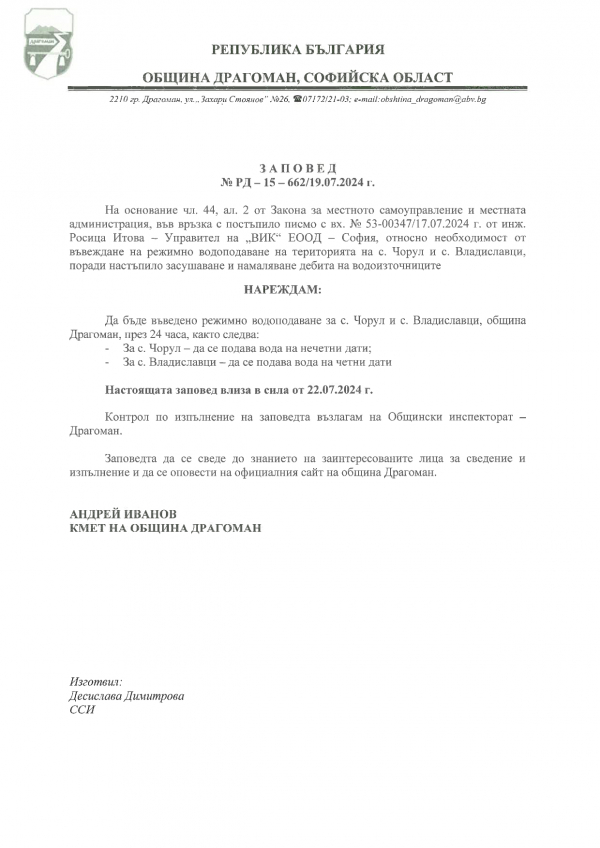Във връзка с настъпилото засушаване и намаляване на дебита на водоизточниците, ще бъде въведено режимно водоподаване на територията на драгоманските села Чорул и Владиславци. Това става ясно от заповед на кмета на община Драгоман – Андрей Иванов. За село Чорул вода ще се подава на нечетни дати, а за Владиславци – на четни. Заповедта влиза в сила от 22 юли 2024 г.
