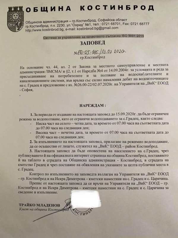 До 15.09.2020 г. ще бъде ограничен режима на водоподаване в с. Градец. Причината е силно намаления дебит на водоизточниците на селото. Това става ясно от заповед на кмета на община Костинброд Трайко Младенов. Ето какво гласи заповедта: