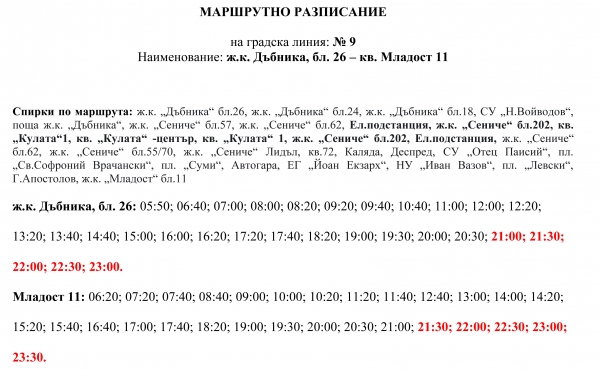 Оптимизацията на разписанието касае последните курсове на градска линия №9, като последният от спирка ж.к. „Дъбника“ ще бъде в 23:00 ч., а от кв. „Младост“ в 23:30 ч., разпределени през 30 мин.