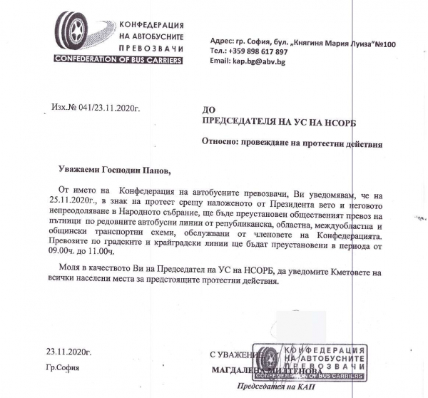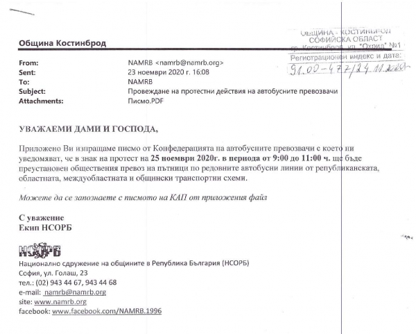 Във връзка с писмо от Конфедерация на автобусните превозвачи и уведомление от „Автобусни превози-Костинброд“ ООД, е възможно да бъде преустановен автобусният превоз на пътници за времето от 09:00ч. до 11:00ч. на 25.11.2020г. /сряда/ по всички автобусни линии обслужвани от дружеството. За това информират от Община Костинброд.
