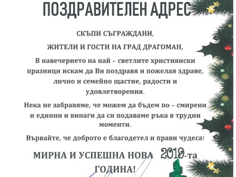 Поздравление към своите съграждани по повод настъпването на новата 2019 година отправи кметът на община Драгоман Андрей Иванов. Приветствието беше публикувано на официалния сайт на местната администрация. Ето и пълният му текст: